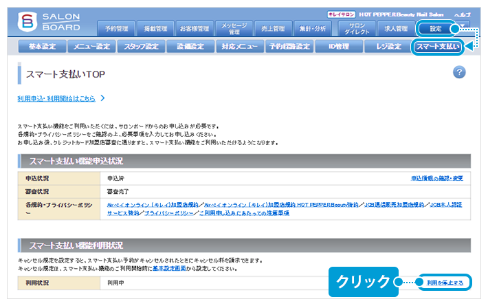 利用を停止すると、即時にスマート支払い予約の新規受け付けが停止されます。