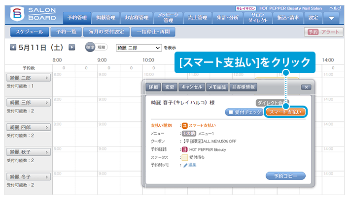 「スケジュール」「予約一覧」「予約詳細」からスマート支払いの売上確定をする予約を選択します。